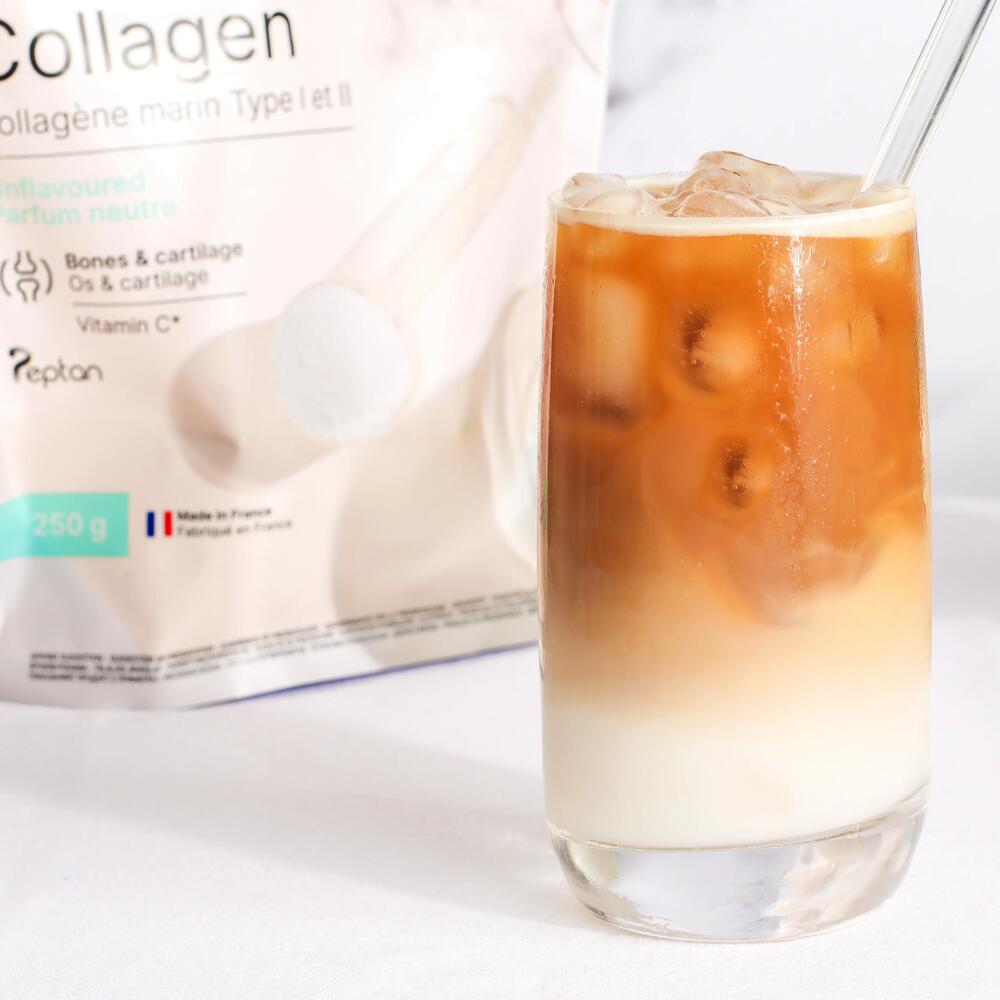 Dans un verre, mélanger le lait ou la boisson végétale, le collagène, et le café froid. Ajouter un peu de sucre, si vous souhaitez une boisson sucrée.